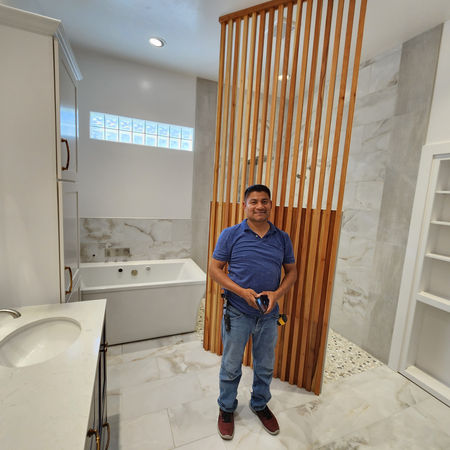 The focal point of the suite is a custom-fabricated accent wall that defines the space and controls sightlines. Its execution required exact alignment and structural coordination to achieve the intended effect without compromising function. The wall is paired with a jetted soaking tub, curated accent mirrors, and a custom bookshelf that doubles as a concealed entry to the walk-in closet. Each element was designed to feel intentional and integrated rather than decorative.